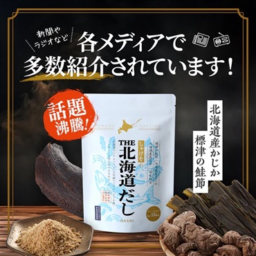 『標津の鮭節』×『北海道産かじか』×『北海道産昆布』×『国産椎茸』をブレンドした、他には無いこれぞ北海道のだし『THE北海道だし』。