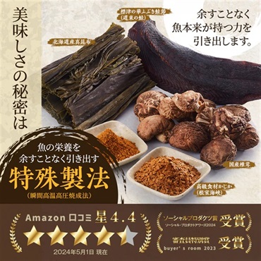 本来魚が持つ力を余すところなく引き出すための特殊製法、瞬間高温焼成法を使って、魚本来が持つ旨味や香りを抽出するだけでなく、タンパク質、Caなどの微量ミネラル、ビタミンなどの栄養素も豊富お気軽にお召し上がりいただけるよう工夫されています。