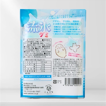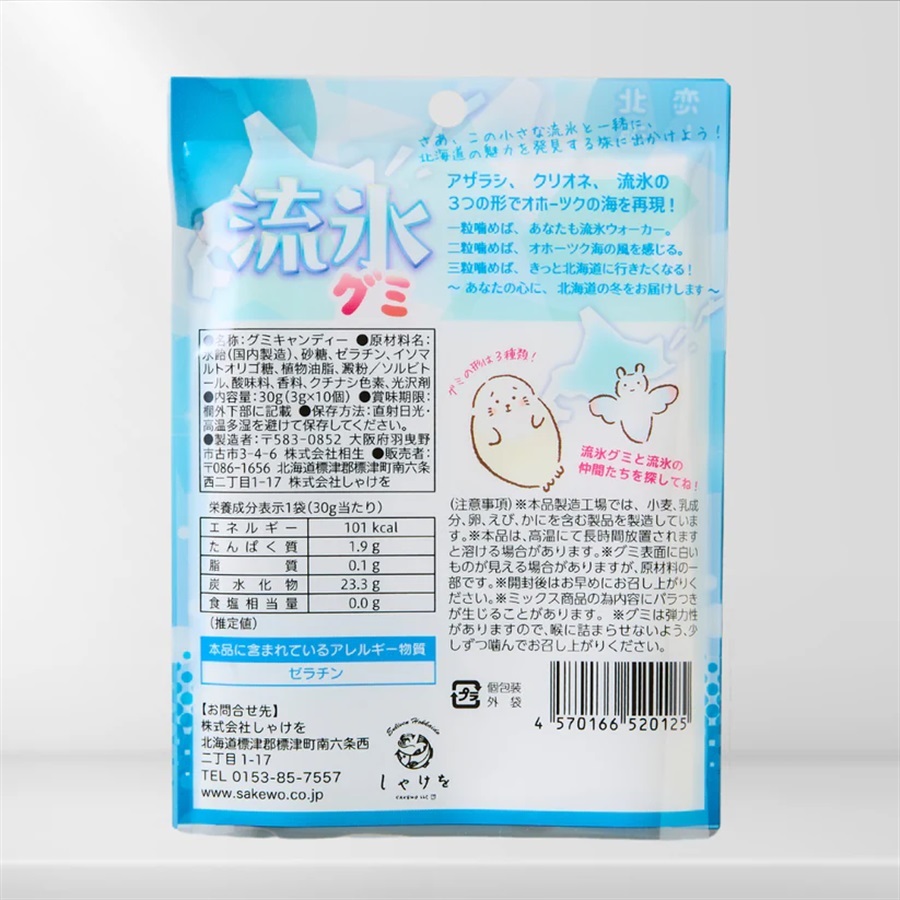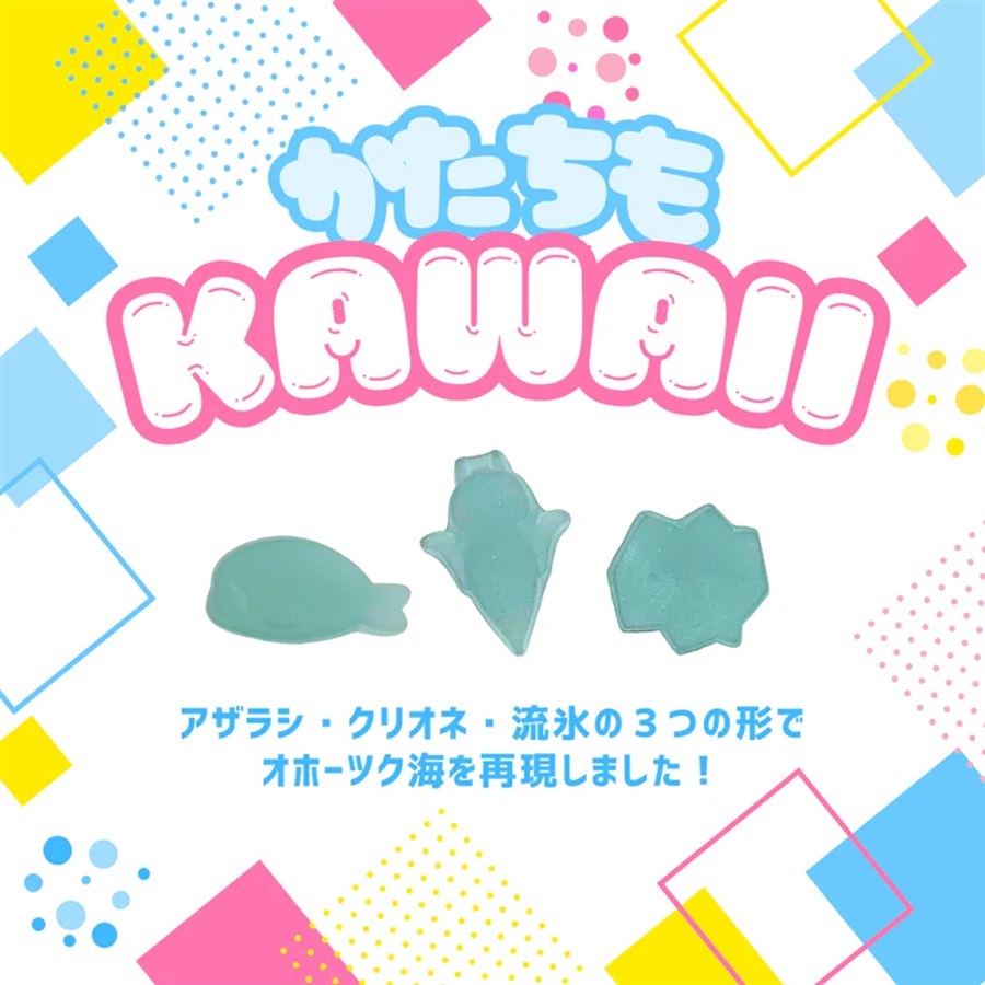 「流氷グミ」は、流氷をはじめ北海道の海洋生物である「クリオネ」、「アザラシ」と「流氷」の3種類のユニークな形状が楽しめるグミです。