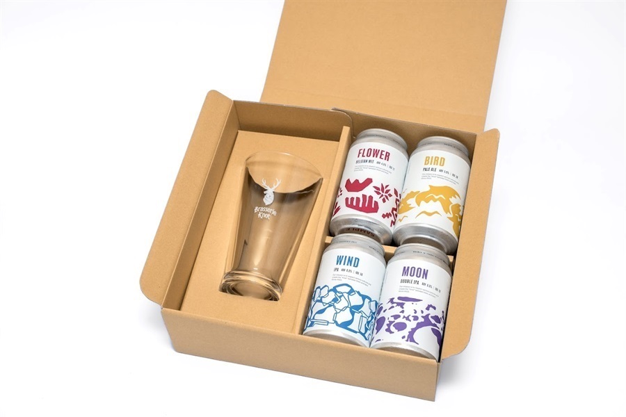選べる2種のギフトセットは、定番4種各2缶が入った8缶セットと、定番4種各1缶にBrasserie Knotオリジナルグラスが付いたセット。