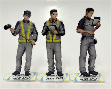 それぞれのキャラクターがAIRDO運航乗務員・客室乗務員・整備士・グランドスタッフの制服を着用しています。
